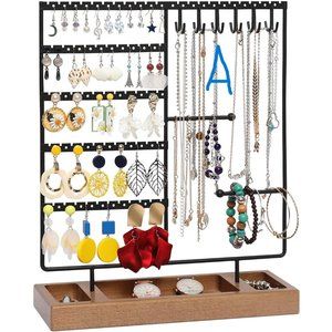 【PERFECT GIFT CHOICE】Our ear stud holder made of natural wood and black metal, matte finished by high quality black powder; design with a tray allows for quick access to your earrings, rings, necklace or bracelets.This earring holder stand would be a great gift choice for any girl or woman.