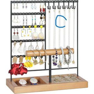 Patent PendingEASY TO KEEP JEWELRY ORGANIZEDX-cosrack 5-tier jewelry organizer holder with wooden groove design, with earring holes and hooks, metal bar, not only can place earrings,but also bracelets, necklaces, rings, watches, etc. Quickly find the right jewelry pieces for your outfit,saving you time.
