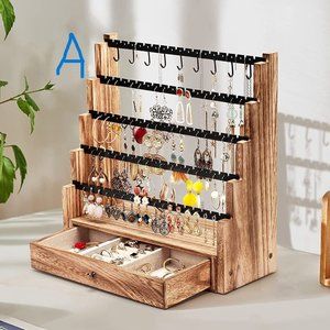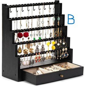Large Storage: Whether you call it earring organizer, jewelry stand or necklace holder, we are proud to organize and display your favorite jewelry. Equiped 5 Layer metal bar with 130 holes and 50 grooves, 5 necklace organizer hooks and wood drawer with rings tray, large capacity for organize your necklaces, earrings, rings, bracelets, watches, hairpins and other small accessories.