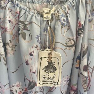 Brand new with tags! This beautiful light blue floral printed pullover boutique blouse tunic top is by Easel. The top has a wide neckline that sits on the shoulders and gives a relaxed longer length fit. The elbow length sleeves have adorable feminine ruffled detailing. The top is made of a silky material. Women’s size medium