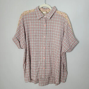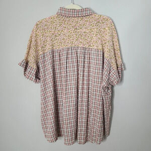 New! Easel Button Front Collared Plaid Floral Short Sleeve Blouse S