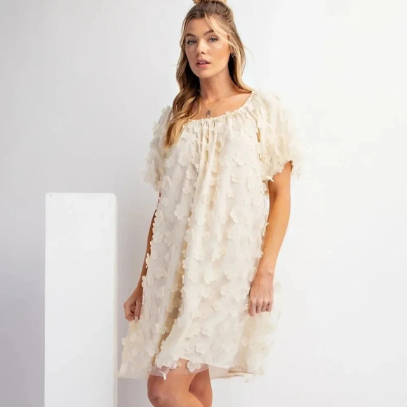 Style: Short Puff Sleeve Floral Flower Appliques Cream Ivory Offwhite Off White Mesh Gauze Spring Summer Easter Scandi Girl Rehearsal Dinner Bride Wedding Reception Event Gala Dress Flowercore Babydoll Fit Fashion Blogger Favorite On Trend Trendy Waffle Gauze Cotton Comfy Relaxed Fit Boho Everyday Casual Dress Fall Spring Summer Winter Versatile Anthro Peasant Southern Style Coastal Cowgirl Lagenlook Layer Layering Western Country Farmcore Free People Bohemian Cottage Core POL Easel Cottagecore Staple Capsule Wardrobe Ideas