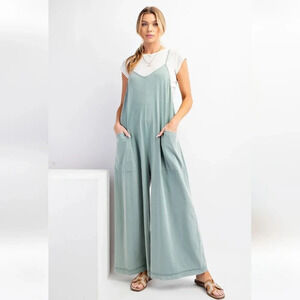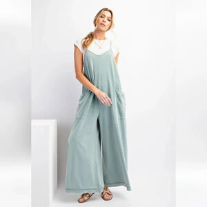 New Easel Dusty Blue Mineral Washed Cotton Jumpsuit