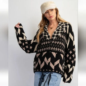 New with Tag Easel Black and Taupe Ethnic Printed Knit Sweater Cardigan from Luxury Boutique brand Easel which is carried by fine retailers like Anthropologie and Nordstrom