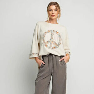 New! Easel Mineral Washed Terry Floral Peace Sign Pullover