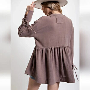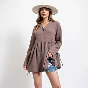 New! Easel Mocha Button Down Long Sleeve Cotton Tunic Top