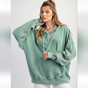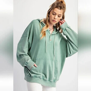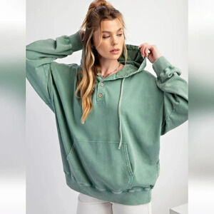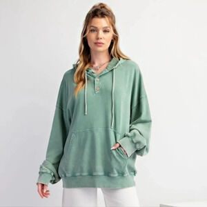New with Tags Easel Peace Symbol Patch Washed Terry Knit Hooded Pullover in beautiful Pacific Green from Luxury Boutique brand Easel which is carried by fine retailers like Anthropologie and Nordstrom