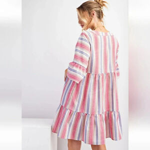 New Easel Pink Striped Poly Linen Ruffle Bottom Dress
