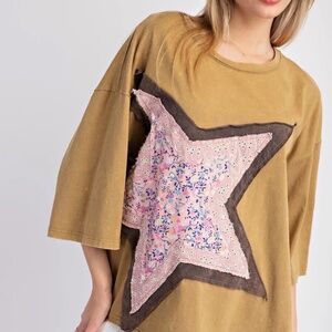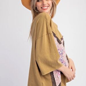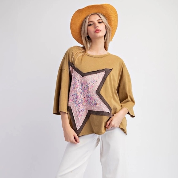 New Easel Star Top Women's Olive Patchwork Boho Shirt Top Pullover Plus Size