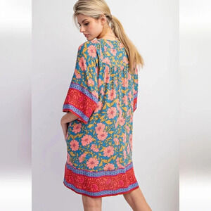 New with Tag Easel Teal Floral Border Printed Rayon Challis Dress from Luxury Boutique brand Easel which is carried by fine retailers like Anthropologie and Nordstrom