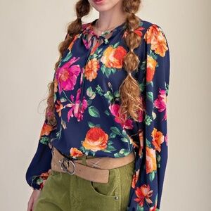 New Easel Women's Floral Tie Neck Blouse Pullover Woven Long Sleeve Small BLUE