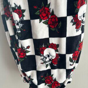 Brand new Ed Hardy blanket Size 60 inches by 70 inches 100% polyester Black, white, skulls, EH, Halloween, cute, spooky, boo, red roses, checkerboard Smoke and pet free home!