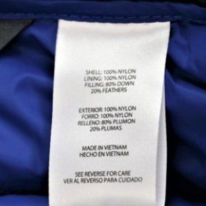 It has a shell of 100% Nylon with a lining of 80% Down and 20% Feather.