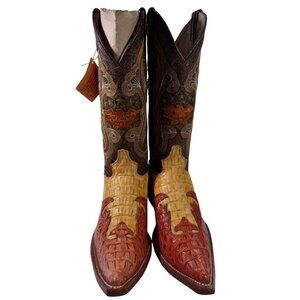 New El General Crocodile Skin Embroidered Red Yellow Brown Cowboy Boots Sz 6.5