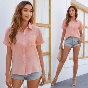 New Elan Lightweight Cotton Button Front Pocket Top in Blush Peach