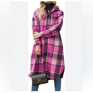 Stylish plaid shacket with button-up front. Features a mix of purple, pink, and white colors.