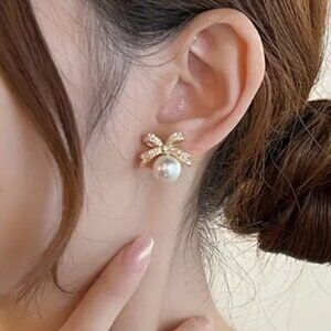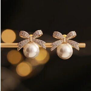New! Elegant Rhinestone Bow & Faux Pearl Stud Earrings