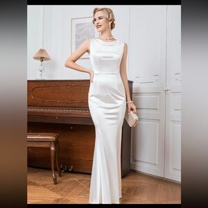 Step into elegance with this stunning white satin evening gown. Perfect for any formal occasion, this dress offers a sleek and sophisticated look.