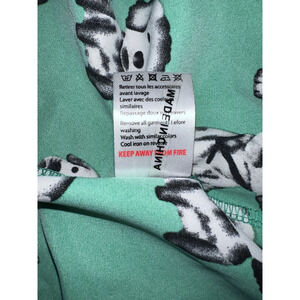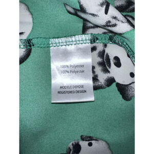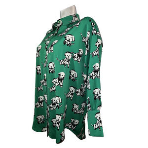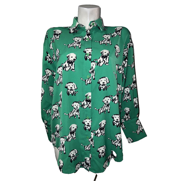 The product is a women's size small green dog print button shirt by Elli White. It features a collared neckline, button closure, and long sleeves. The shirt is made of polyester and has a lightweight, oversized fit, making it ideal for various occasions including casual, workwear, and parties. The novelty print adds a playful touch to the classic style, perfect for those who love animal prints and a preppy aesthetic. The shirt is machine washable and can be worn in all seasons. Made in China.
