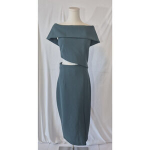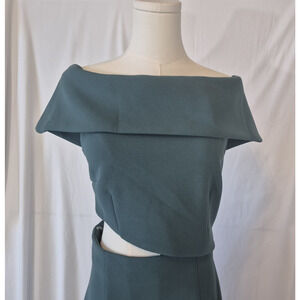 The new Elliatt women's serpentine peacock green midi dress in size medium is a stylish and elegant choice for a wedding, party, or formal occasion. The off-the-shoulder design and short sleeves add a touch of sophistication, while the zip closure makes it easy to put on. Made from a comfortable blend of polyester and spandex, this sheath dress features a solid green color that will make you stand out from the crowd. The midi length is perfect for showcasing your curves while maintaining a flattering silhouette. Perfect for any fashion-forward woman looking to make a statement at her next special event.