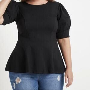 New Eloquii Black Puff Sleeve Peplum Blouse Top Scuba Ponte Back Zip Size 16