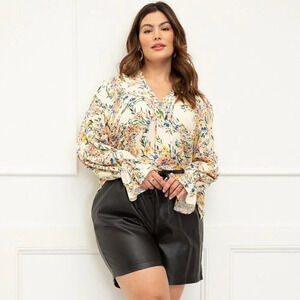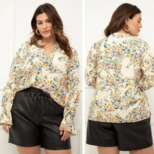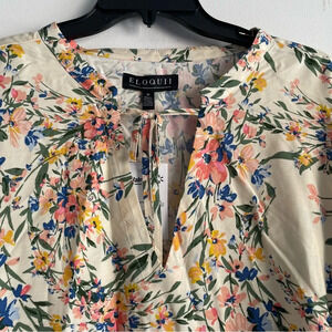 New! Eloquii Cream with Orange Green Floral Print Tie Neck Blouse - 22474