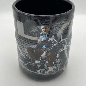 This limited edition Elvis Presley coffee mug is a must-have for any fan of The King. Featuring a raised design with Elvis Presley sitting on a motorcycle with wings in the background. Its a beautiful black mug with Elvis written in beige, gray motorcycle, and Elvis himself with a pop of color, sporting his black leather jacket. This medium-sized cylinder mug is perfect for hot or cold beverages. Hand wash only and made of ceramic & porcelain, this mug is a unique addition to any collection.