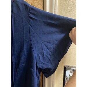 Elevate your wardrobe with this beautiful navy blouse from Emery Rose. The V-neckline and short flared sleeves make it perfect for any occasion, whether it's a casual day at work or a night out with friends. The blouse is made of lightweight and breathable polyester material, making it comfortable to wear all seasons. It features a faux button and ruffle accents that add a touch of bohemian and classic style to your outfit. The blouse is also easy to care for as it is machine washable. This plus-size top has a regular fit and measures 28 inches in length, with a waist flat of 23 inches and a width of 24 inches.