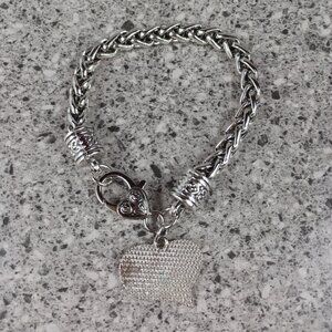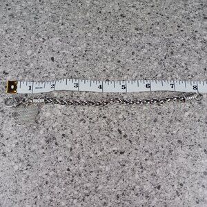 Bracelet is 20 cm (almost 8 in), has a pull back clasp to put on, and silver plating for looks.