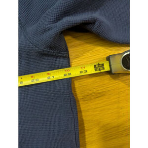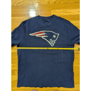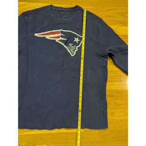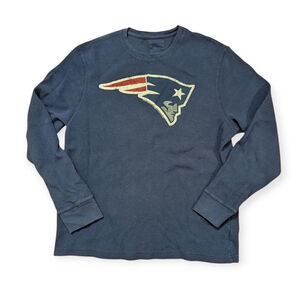This men's navy blue long-sleeve thermal tee features a crew neck and a waffle knit texture. A distressed New England Patriots logo, in red, white, and blue, is prominently displayed on the front. The shirt measures approximately 22 inches across the chest (pit-to-pit) and 28 inches in length from shoulder to hem. There is no size tag - please use measurements to compare to a garment you own. Fits like a large, maybe even XL.