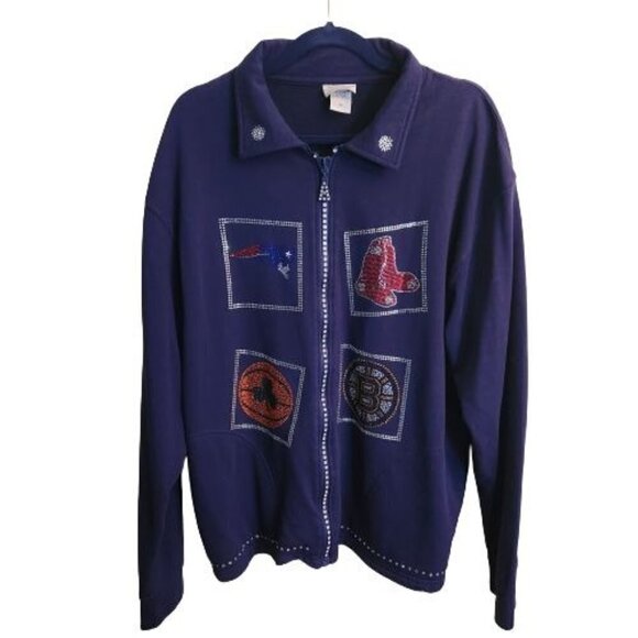 New England Sports Lover's Dream Navy Rhinestone Full Zip Sweatshirt, Size 1X. Pit to pit 25", shoulder to hem 28", Incredible Red Sox, Patriot, Bruins, Celtics All Represented, Rhinestone Zip, 1 tiny rhinestone missing, Unique, Sports, Boston. Good Pre-Owned Condition