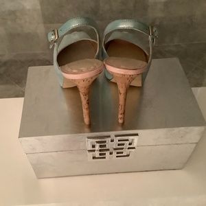 Brand new… gorgeous Aqua Irridescent Learher with a cork heel. 5 inch heel 1 1/2 inch wedge in front. Size 6.5