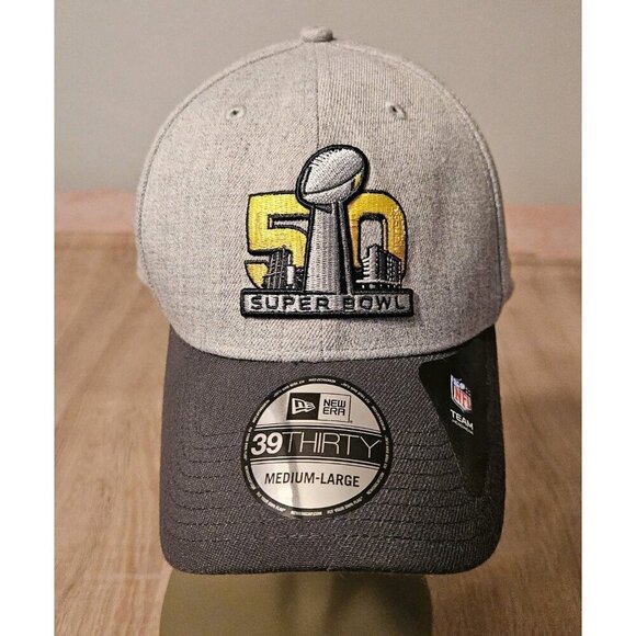 The product is a New Era 39thirty Super Bowl 50 Fitted Cap in size Medium Large. It is an officially licensed cap featuring the National Football League (NFL) branding, specifically for the Super Bowl 50 event. The cap is gray in color and designed as a unisex adult apparel item. Made in China, this cap is a great choice for fans looking to commemorate the Super Bowl 50 tournament with a stylish and comfortable piece of fan apparel.