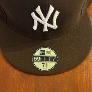 Sleek brown baseball cap with white NY Yankees logo. Fitted design by New Era 59Fifty. 7.5