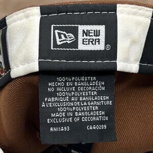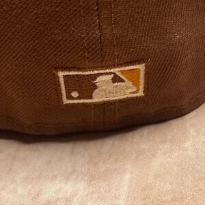Fitted hat with a brown base and blue bill. Thick embroidery of Chicago Cubs logo. Major League Baseball logo embroidered on back. Flat bill that is slightly curved. New Era 59fifty.