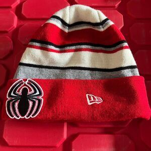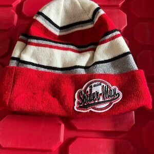 Spider-Man beanie with embroidered Spider-Man patch on the front, featuring red and white colors.