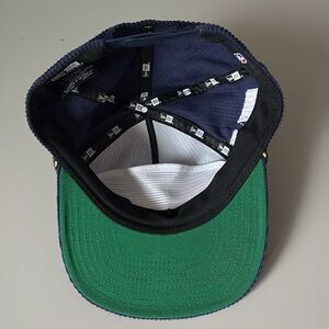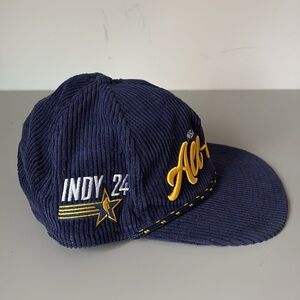 The 2024 NBA All-Star Game Golfer features an embroidered NBA All-Star Game wordmark at the front panels with a matching Indy '24 patch at the right-wear side, a navy corduroy fabrication, a green undervisor, and a snapback closure at the rear.