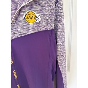 Command attention in this vibrant NBA Los Angeles Lakers half-zip pullover jacket. This eye-catching piece features a unique color-blocked design with a marled purple and white upper section and a solid purple lower section. The Lakers logo is prominently displayed on the chest, while the team name runs vertically along the zipper. Thumb holes at the sleeve cuffs are a bonus! Perfect for game days, casual outings, or adding a sporty touch to your everyday wardrobe. A new addition to your collection, it will make a bold statement at the gym or on the go.
