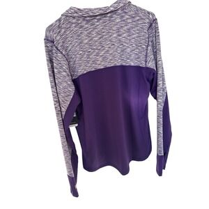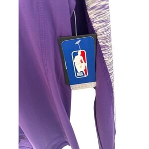 Keywords: New Era, NBA, Los Angeles Lakers, Purple Jacket, Half Zip Pullover, Women's Activewear, Athletic Jacket, Sports Apparel, Lakers Gear, Thumb Hole Jacket, Purple and White Jacket, Color Block Jacket, NBA Jacket, Basketball Jacket