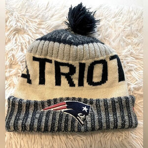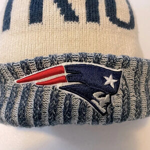She’ll 100% acrylic, lining 10% wool and 90% polyester. New England Patriots NFL knit hat. Measures 9” from folded brim to top of head.