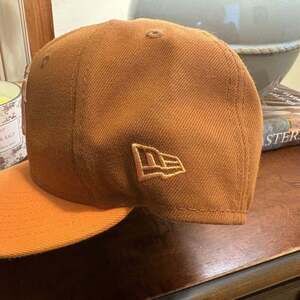 New Era San Francisco Giants Spring Color Two-Tone 59FIFTY Fitted Hat in brown and orange. This hat features the classic "SF" logo embroidered on the front, an orange brim, and the MLB logo on the back. Made from 100% polyester, this fitted cap is a stylish way to support the Giants. Excellent condition, appears unworn.