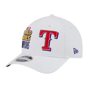 The Texas Rangers Championship Pack 9FORTY M-Crown Snapback features an embroidered Texas Rangers logo and 2023 World Series wordmark at the front panels with a matching patch at the right-wear side. Additional details include a team color themed MLB Batterman logo above a snapback closure at the rear and a green undervisor. Made in Bangladesh.