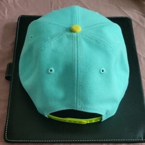 Vibrant turquoise cap with lime green brim. Embroidered front logo. Perfect for a bold style.