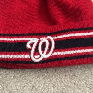 Keywords: Washington Nationals, MLB, Knit Beanie, Winter Hat, Pom Beanie, Baseball Hat, Red Beanie, Nationals Hat, Team Apparel, Fan Gear, Sports Hat, Winter Cap