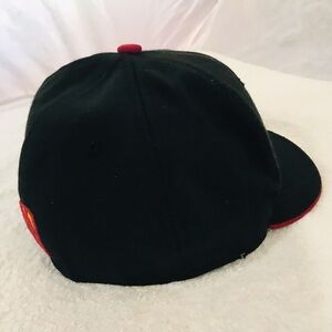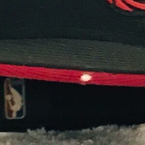 Stylish black cap with red and white basketball logo. Perfect for sports fans.