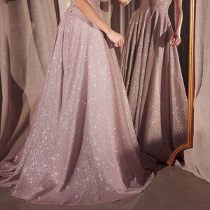 This stunning strapless A-line dress features a shimmering glitter finish that adds elegance and charm. The pleated details create a graceful flow, enhancing the overall look. With a stylish lace-up back, this long dress offers both beauty and a perfect adjustable fit, making it ideal for any special occasion.
