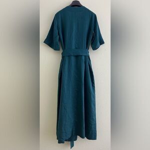 This piece features a wrap silhouette, midi length, short sleeve, partial lining, waisted with self-tie belt, in linen.