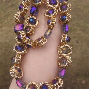 New Eye Candy Los Angeles two strands statement necklace 14 Kt gold plated alloy has that aurora borealis glint sparkle in the bluish purplish color spectrum it glistens and so sometimes you see bluish and other times purplish see video of the colors dancing in the natural light . New with one manufactire's tag . Measures at the longest ~ 20 inches tape measure in pictures above , questions are always welcome . Mannequin's neck measures 15".