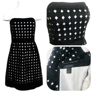 Gorgeous! NEW NO TAG White House Black Market Eyelet Strapless Dress. A-line fit and flare Dress Size 4 Black Over White Eyelet, Fully lined, Rubber line around chest for support. Boning.length about 30in, waist about 14,5 in across, bust about 17 in across, zipper on the side. Stock pic only for viewing.