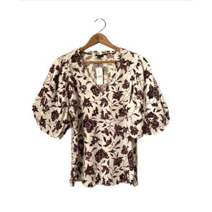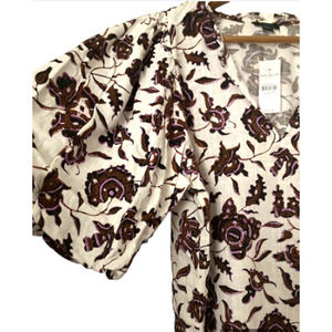 # white blouse, floral blouse, puff sleeve blouse, new with tags, women's small, bohemian style, floral shirt, floral top, purple floral, brown floral, floral print, floral pattern, shirt, blouse, top, puffy sleeves